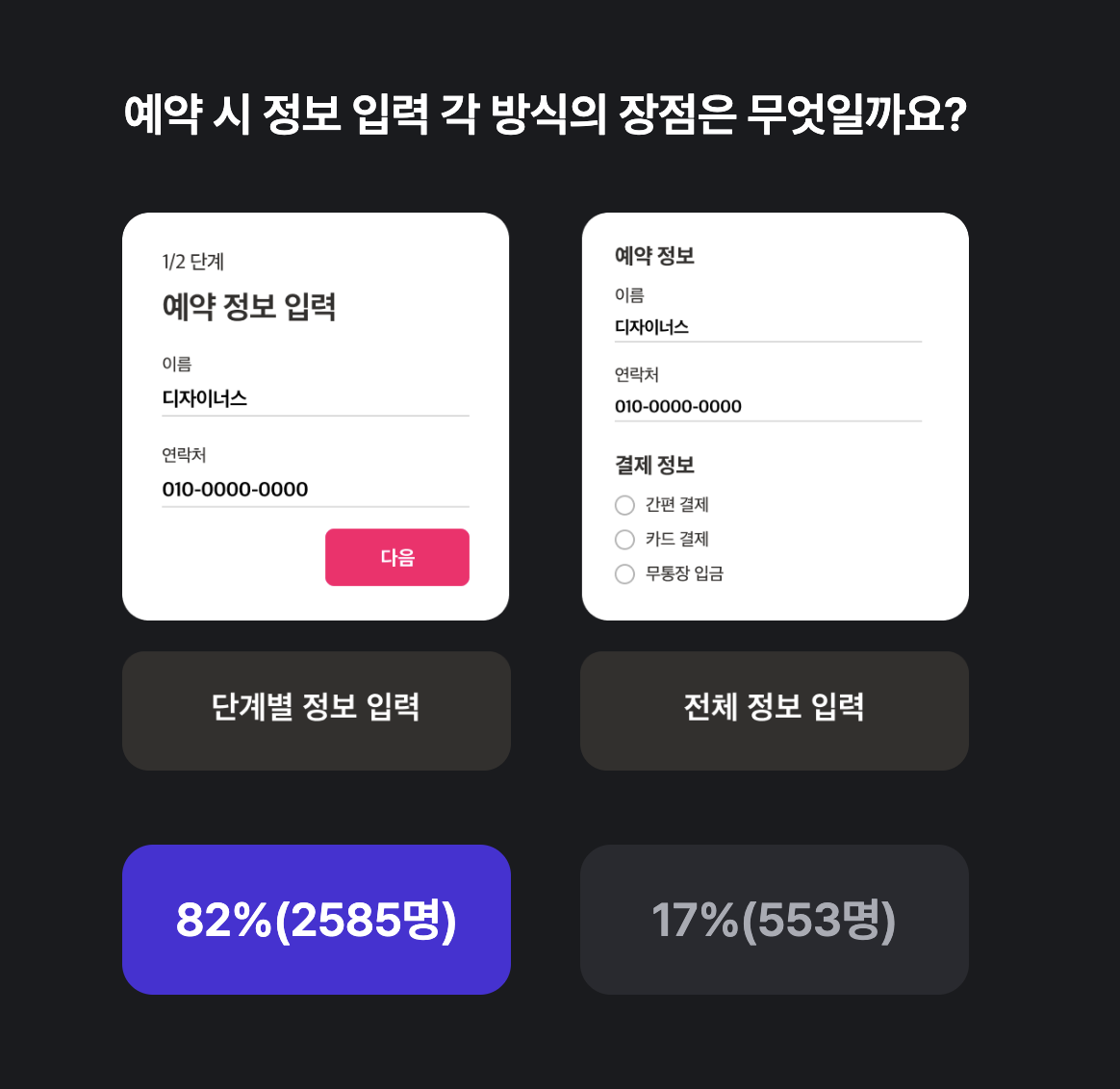 ๋ ฅ ๋ฐฉ์์ ์ ๋ณด๊ฐ ๋ง์์๋ก ์๊ฐ์ ์ผ๋ก ๋ถ๋ด์ค๋ฝ๊ณ ๋ณต์กํ๊ฒ ๋๊ปด์ง ์ ์๋ค. ๋จ๊ณ๋ณ ์