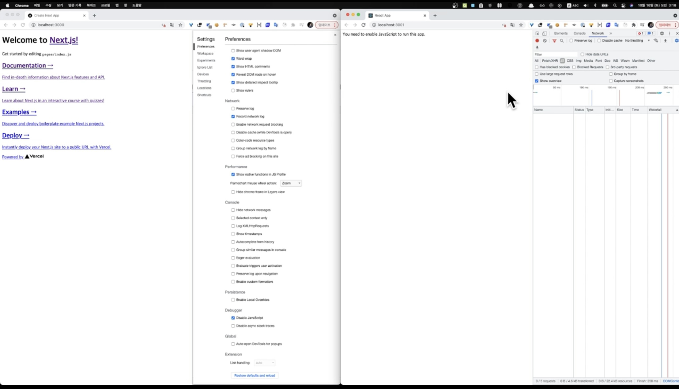 next.js 프로젝트를 npm run dev 를 통해 dev 서버를 실행하고, preferences 에서 JS를 제거하면,