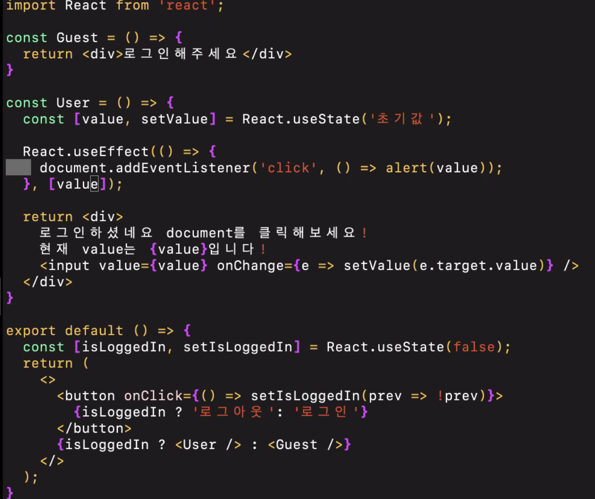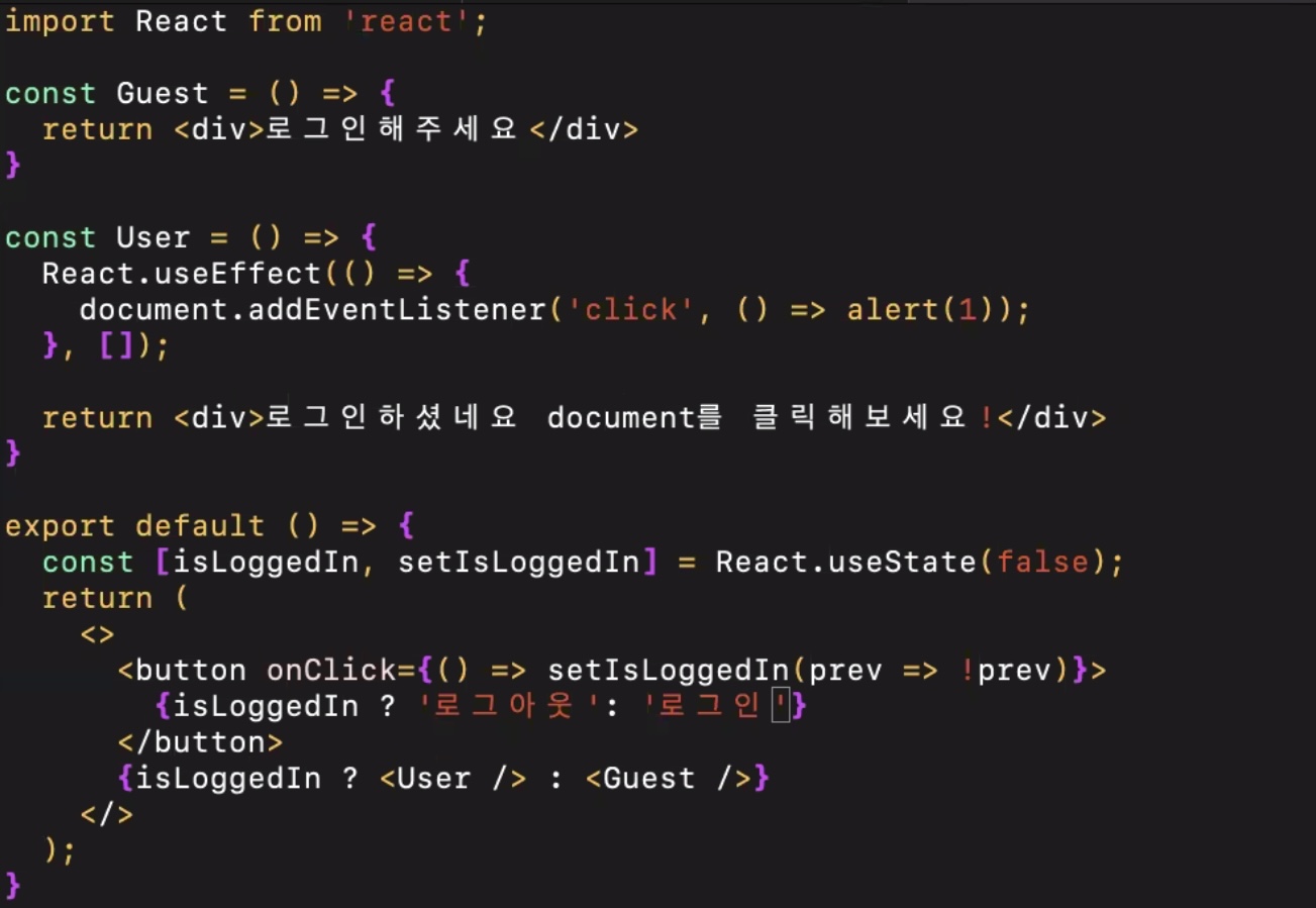 이 예제는 버튼을 누르면 User 컴포넌트와 Guest 컴포넌트가 토글 형식으로 바뀌는 코드이다.