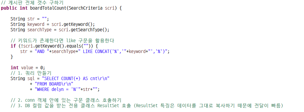 BoardDao에 boardSelectAll메소드와 boardTotalCount메소드에 매개변수로 SearchCriteria scri를 넘겨 받을 수 있게 수정해주고 넘겨 받은 값을 String으로 꺼내서 sql 구문을 수정해준다