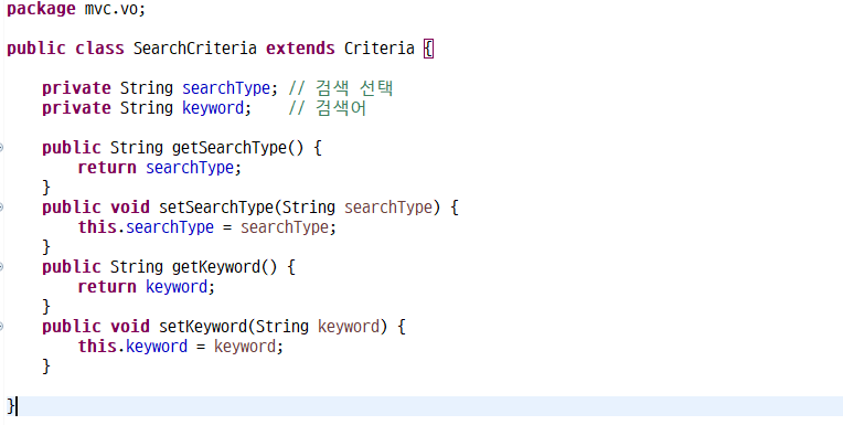 BoardVo 패키지 안에 있는 vo 패키지에 페이징 기능을 만들 때 생성했던 Criteria 클래스를 상속 받는 SearchCriteria 클래스를 만들어준다