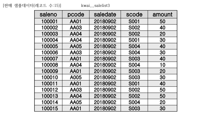 -- INSERT INTO kwai__salelist3(saleno ,pcode, saledate , scode, amount) VALUES( 100001 , 'AA01' , '20180902' ,'S001',50);