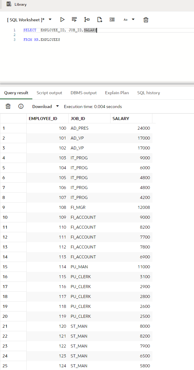 SELECT EMPLOYEE_ID, JOB_ID,SALARY