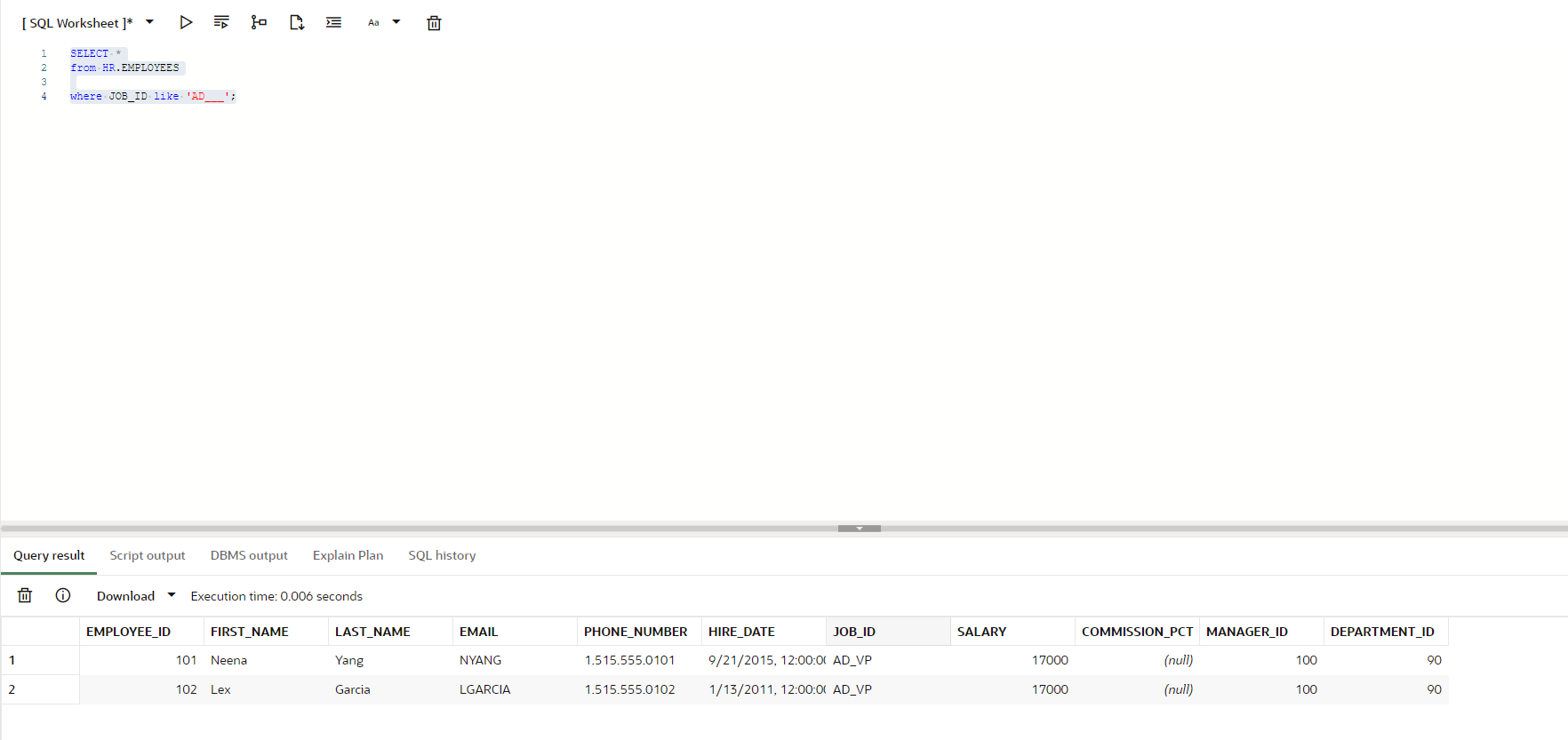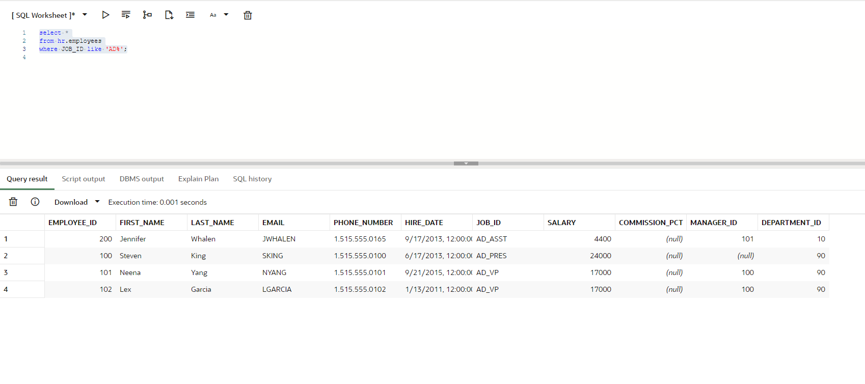 where JOB_ID like 'AD%';