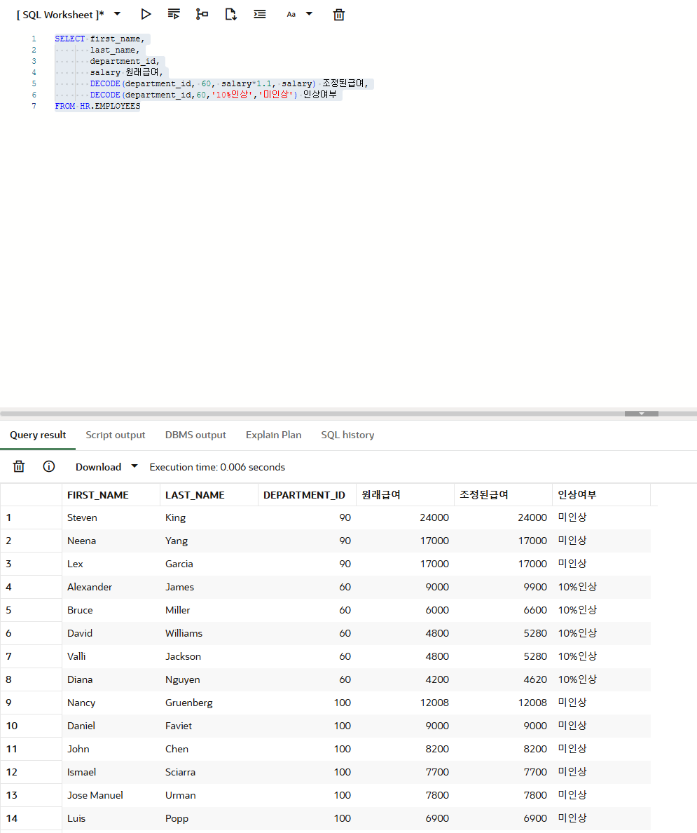 DECODE(department_id, 60, '10%인상', '미인상') 인상여부