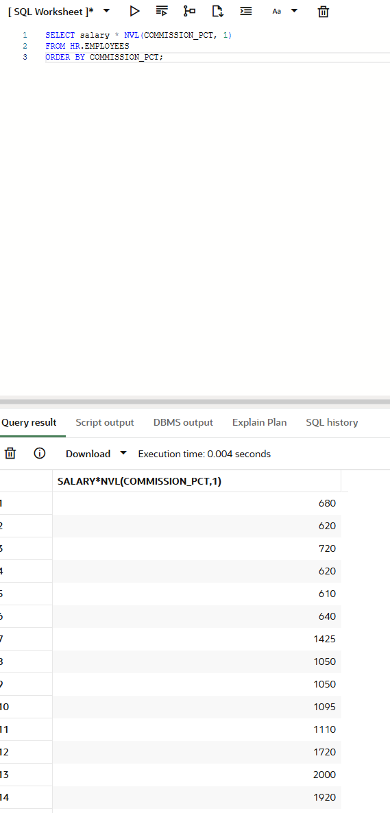 SELECT salary * NVL(commission_pct, 1)