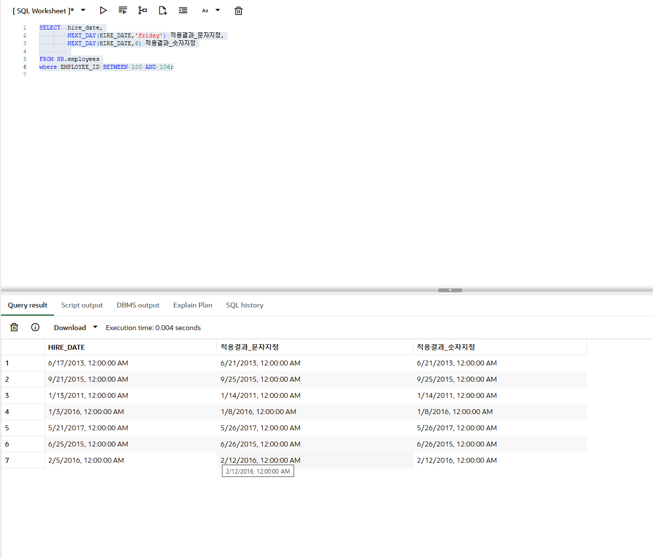 NEXT_DAY(HIRE_DATE,'friday') 적용결과_문자지정,