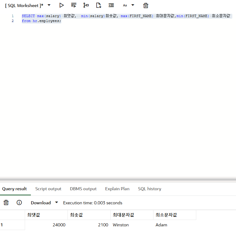 SELECT max(salary) 최댓값, min(salary)최솟값, max(FIRST_NAME) 최대문자값,min(FIRST_NAME) 최소문자값