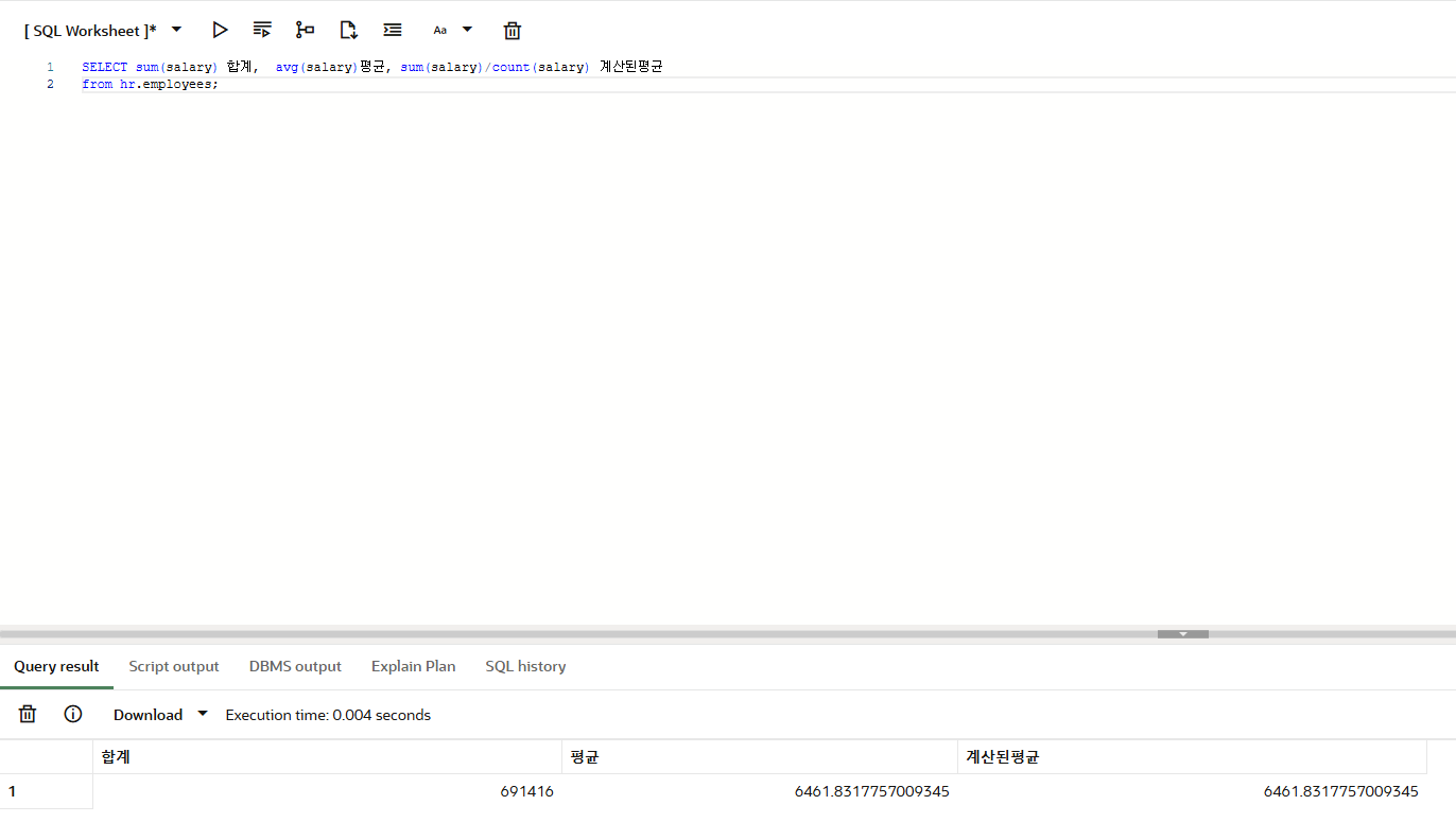 SELECT sum(salary) 합계, avg(salary)평균, sum(salary)/count(salary) 계산된평균