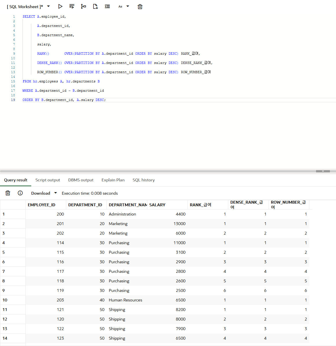 이번에는 전체가 아닌 PARTITION BY 절을 사용해 department_id, 즉 부서별로 그룹화한 후 salary 값이 높은 순(내림차순)으로 순