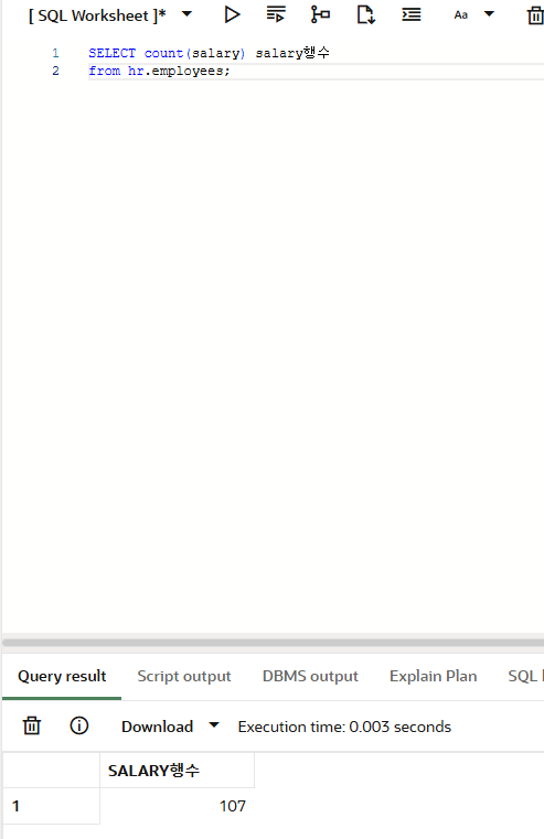 | COUNT | 행 개수를 셈 | COUNT(salary) | (*)의 경우 null 값도 개수로 셈 |