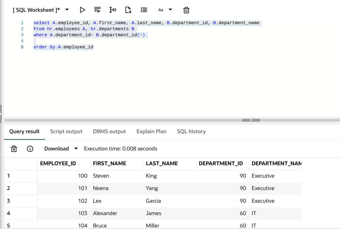 where A.department_id= B.department_id(+)