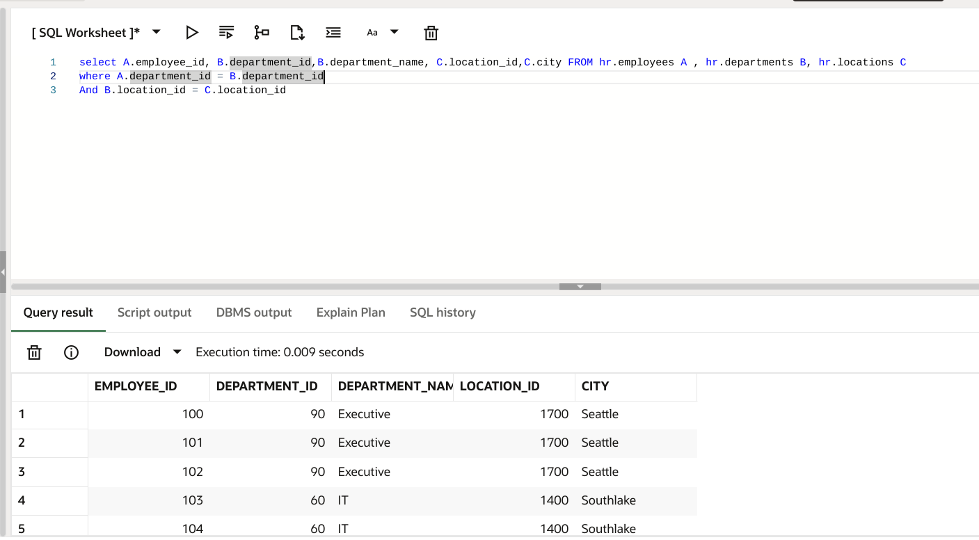 select A.employee_id, B.department_id,B.department_name, C.location_id,C.city FROM hr.employees A , hr.departments B, hr.locations C
