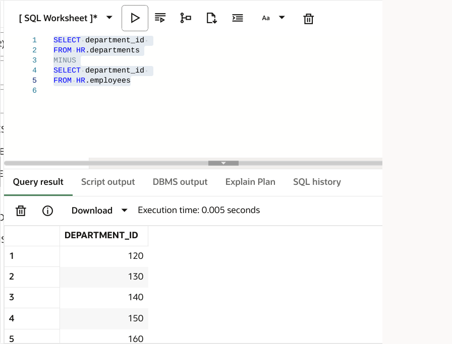 MINUS 연산자는 첫번재 SELECT문의 집합에서 두번째 SELECT문의 집합을 뺀 결과를 출력함