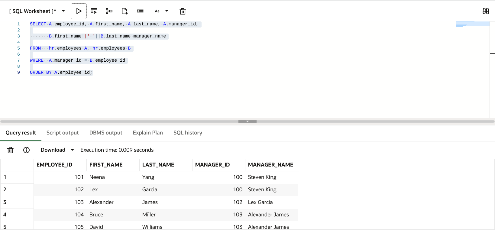 FROM hr.employees A, hr.employees B
