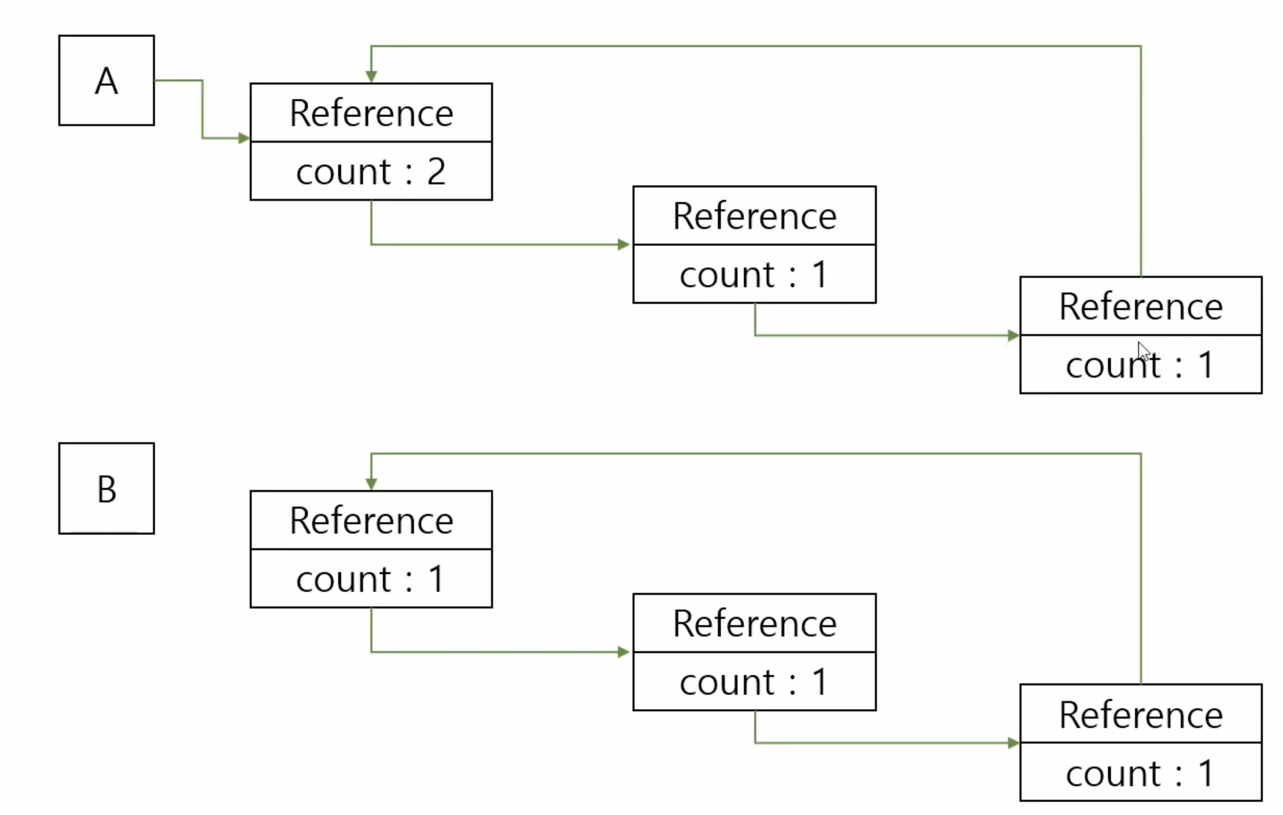 - 단, 순환 참조 구저에서 Reference Count가 0이 되지 않는 문제가 발생하여 Memory Leak이 발생할 수 있음