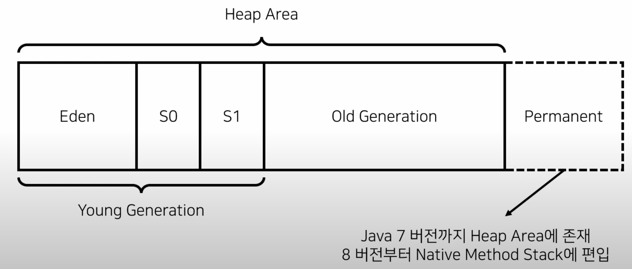전통적인 Heap Area는 아래와 같은 구조를 가지고 있으며, Eden, Survivor1, Survivor2, OldGeneration로 구분됨