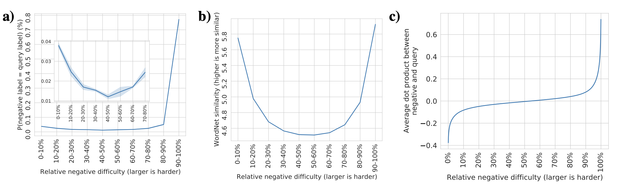 As you can see from the Figure b), semantic similarity (y-axis) is high in both easy (cosine similarity around -1) and difficult (cosine similarty close to 1).