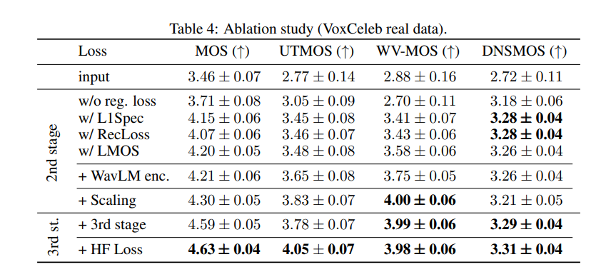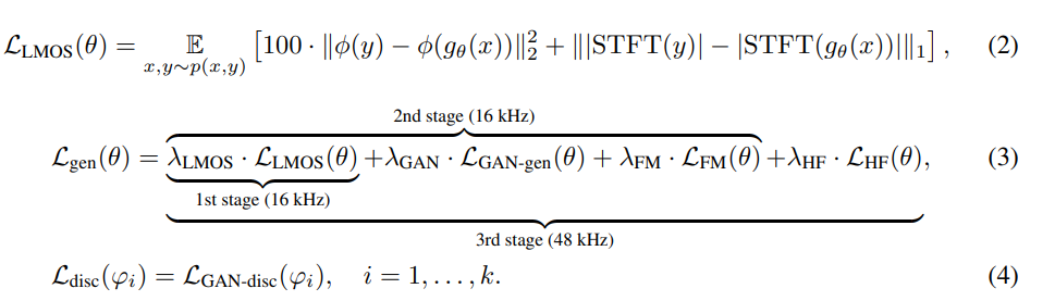 In the third stage, the adversarial training is done, but in the sampling rate of 48 kHz to generate a studio-quality speech enhancement. In this stage, the relative weight on adversarial losses increase in order to focus on the perceptual quality. UTMOS and PESQ loss are included as well.