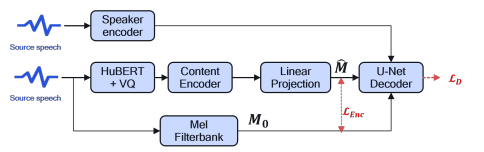 Second loss is a diffusion loss that make the final output mel spectrogram that was fed with both the speaker embedding and the content embedding closer to the clean mel filterbank.