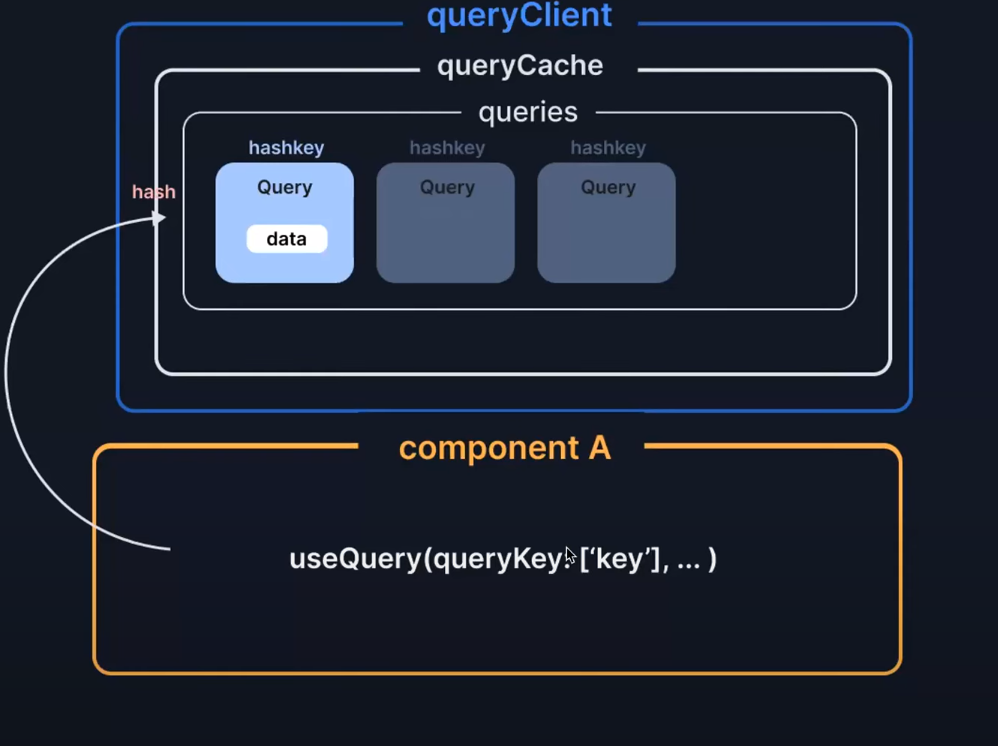 먼저 컴포넌트에서 useQuery가 실행되면 생성된 Query 인스턴스와 함께 key 값으로 mapping 시키는 과정을 거친다.