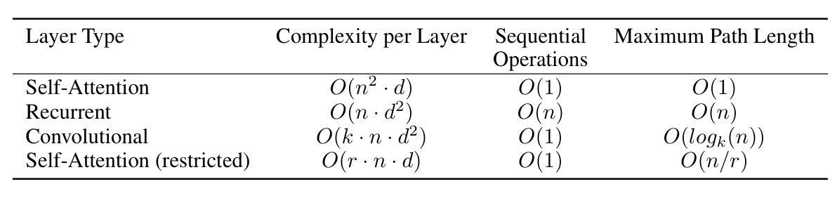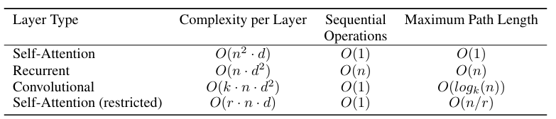 Self-Attention 층은 일정한 수의 순차적 연산을 통해 모든 위치를 연결할 수 있는 반면, Recurrent 층은 O(n)개의 순차적 연산이 필요함.