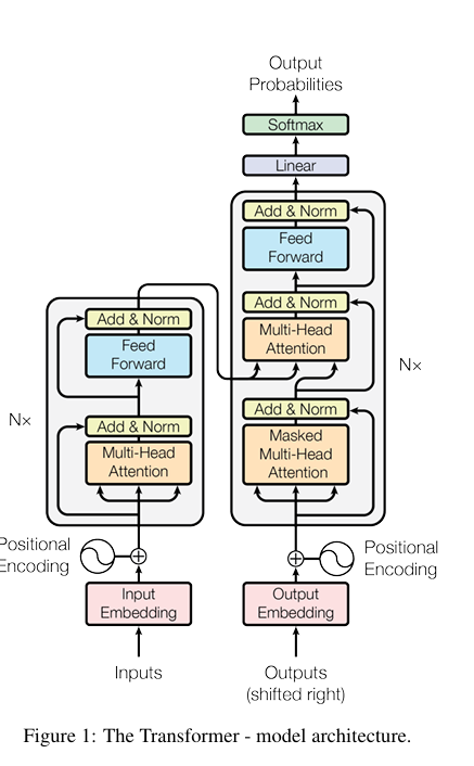 Output Embeddings은 한 위치씩 밀려 있어, 위치 i에 대한 예측이 i보다 작은 위치의 알려진 출력에만 의존하도록 보장 (shifted right를 의미)