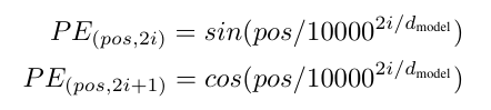 pos : 시퀀스 내에서의 위치 / i : 차원 (위치 인코딩의 각 차원은 개별적인 사인, 코사인 함수에 해당함))