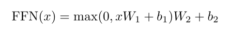 FFN은 두 개의 선형 변환과 그 사이에 ReLU 활성화 함수로 구성됨.