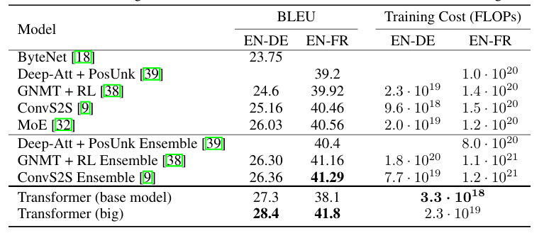 WMT 2014 영어-독일어 번역 작업에서 28.4 BLEU 달성함.