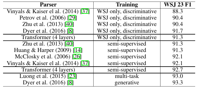 RNN 기반 sequence-to-sequence 모델과는 달리, 40K 문장의 WSJ 학습 세트에 대해서만 학습하더라도 Berkeley Parser보다 높은 성능을 기록함.