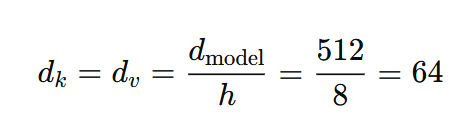 실제 실험에서는, h=8개의 병렬 어텐션 레이어를 사용하며, 각 헤드의 차원은 다음과 같다. 각 헤드의 차원을 줄였기 때문에, 전체 계산 비용은 Single-Head Attention과 비슷하게 유지됨.