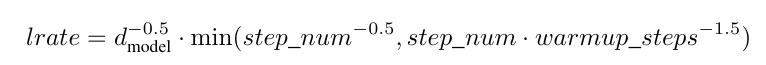 learning rate는 다음 공식에 따라 조정됨. (처음 warmup_steps 동안 선형적으로 학습률을 증가시키고, 이후에는 step 수의 역제곱근에 비례하여 감소)