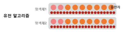 염색체 (chromosome)(=individual)는 여러 개의 유전자 (gene)로 구성되며, 각 유전자는 문제 공간의 한 부분이다. 전체 염색체는 문제 공간을 염색체 공간으로 인코딩한 것을 의미한다.