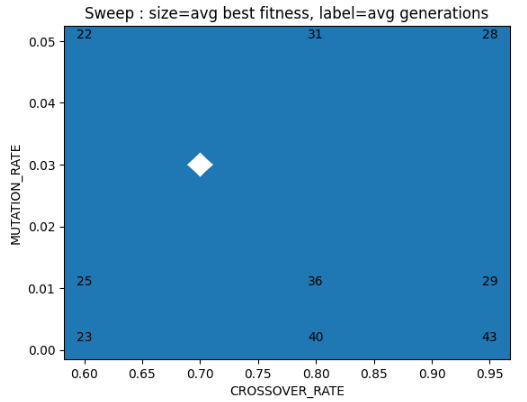 # We'll map x=CROSSOVER_RATE, y=MUTATION_RATE, size=avg_best_fitness, annotation=avg_generations