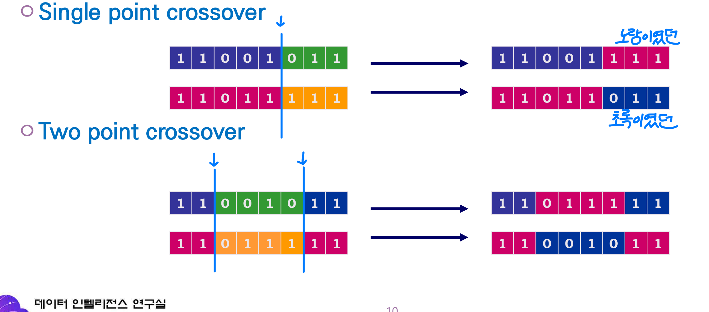 선택된 부모 개체(염색체)로부터 자손(offspring)을 생성하는 과정을 의미한다.