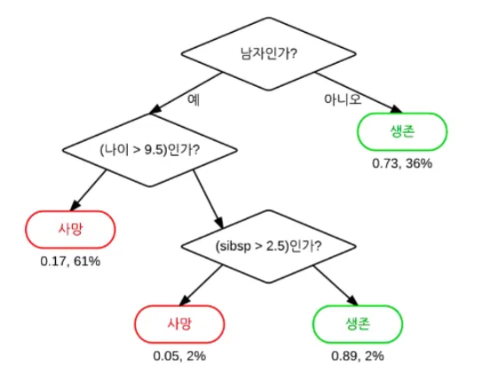 결정 트리란, 일련의 분류 규칙을 통해 데이터를 분류/회귀하는 지도학습 모델 중 하나로, 결과 모델이 트리 구조를 지녀 Decison Tree라는 이름을 지닌다. 아래의 그림처럼 특정 기준(질문)에 따라 데이터를 구분하는 모델을 의사 결정 트리 모델이라고 하며, 한 번의 분기마다 변수 영역을 두 개로 구분한다.