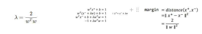 마진은 결정 경계와 가장 가까운 점(서포트 벡터) 사이의 수직 거리(직교 거리)를 의미한다. 이때, 결정 경계의 수식은 이므로 직교 방향이 w의 방향이며, 서포트 벡터는 w 방향으로 ±1만큼 떨어져 있다.