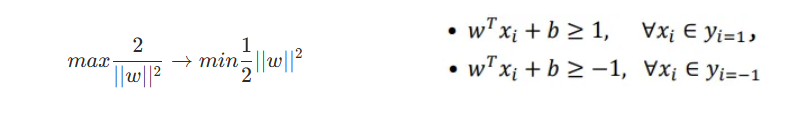 SVM의 목적은 이러한 마진을 최대화하는 결정 경계를 찾는 것이다. 따라서 다음과 같은 최적화 문제로 변환할 수 있다. 원래 SVM의 제약 조건은 과 두 가지이다. 이 두 가지를 한 번에 표현하기 위해선 이라는 성질을 이용할 수 있다. 따라서 두 조건을 포함하여 로 표현할 수도 있다. 그리고 이를 로 변형할 수 있다.