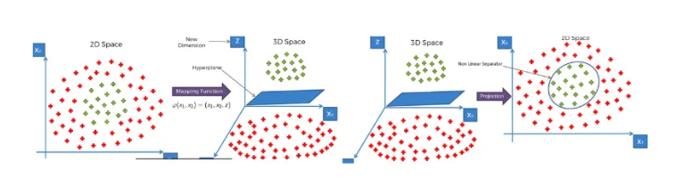 현실 세계의 데이터는 대부분 Feature가 여러 개이고, 선형적으로만 데이터가 존재하지 않는다. 따라서 SVM으로 Non-Linear Data를 분류하기 위해서는 커널을 통해 차원을 변경해야 한다. 따라서 SVM은 커널 함수(ex. Linear Kernel, Polynomial Kernal 등)를 통해 데이터를 고차원 공간으로 매핑해 선형적으로 구분할 수 있게 만든다. 이는 데이터를 고차원 공간으로 직접적으로 매핑시키는 것이 아니다. 커널을 통해 복잡한 저차원 데이터를 선형 분리가 가능한 고차원으로 매핑시켜 처리하는 것이다.