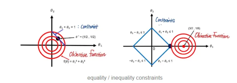 제약사항은 equality constraints, inequality constraints로 나눌 수 있으며, equality constraints는 h(x) = 0으로 나타낼 수 있는 constraint(h(x))를, inequality constraints는 h(x) <= 0을 만족하는 것을 의미한다.