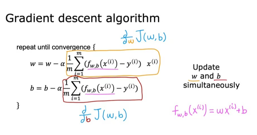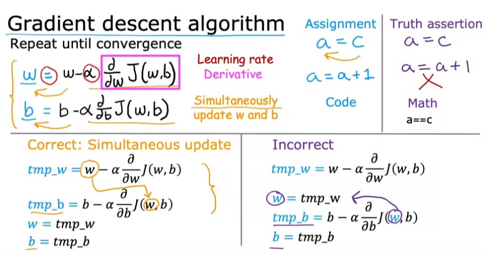 이제 이것에 대해 더 자세히 살펴보자. 앞에서도 말했듯, Gradient Descent은 Cost Function 의 값이 최소가 되도록 w, b 값을 구하는 알고리즘이다. 그렇기 때문에 만약 비용 함수의 값이 최소가 아니라면, 일정한 식에 따라 w, b를 조정하고 Cost Function 가 최소가 되는지 확인하는 과정이 필요하다.