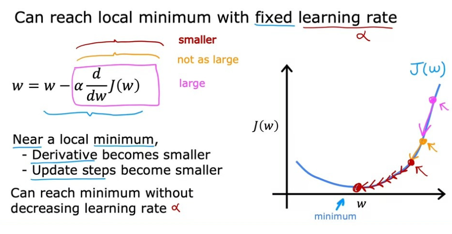또, 우리는 한 번 설정한 α를 학습 과정에서 변경하지 않고 고정시켜도 된다. 왜냐하면 Gradient Descent algorithm의 특성상, 초기에는 의 기울기가 커서 경사하강이 큰 폭으로 진행되다가, 시간이 지나면서 w 값이 변경되고, 최소에 가까워지면서 기울기의 값이 점점 작은 폭으로 변하기 때문이다. 즉, 과정이 진행되면 될수록 천천히 minimum 값에 접근하게 된다는 것이다.