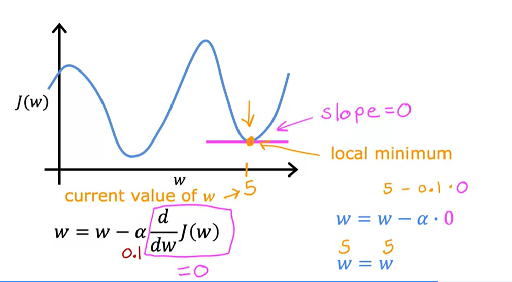 만약, Gradient Descent algorithm을 진행하면서, local minimum 값에 도달했을 때, 우리는 global minimum 값에 도달하기 위해 경사하강의 과정을 한 단계 더 진행해도 될까, 하는 의문이 생길 수도 있다. 그러나 이미 local minimum 값에 도달한 상태에선 도함수의 결과값이 0이 된다. 따라서 경사하강의 과정을 더 진행하고자 해도 w 값이 항상 0이 되기 때문에 이 과정을 더 진행할 수 없다. 그렇기에 새로운 초기 위치를 찾아 다시 Gradient Descent algorithm을 수행하는 것이 좋다.