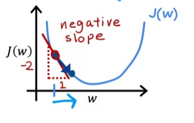 일단, 우리가 도함수의 값을 구하기 위해선 먼저 기울기를 알아내야 한다. 왜냐하면 기울기는 함수 J의 도함수를 나타내는 값이기 때문이다. 따라서 아래의 사진에서처럼 기울기를 구하기 위한 접선을 그리고, 접선을 활용해 삼각형을 그린다. 이렇게 그려진 삼각형을 통해 높이/너비를 구해주면 이 값이 기울기가 된다.