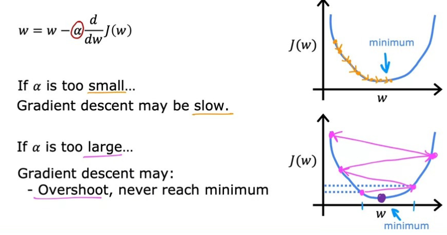 만약 값이 0.0000001과 같이 아주 작다면, 결과적으로 Cost Function J는 최소값에 도달하긴 하겠지만, 너무 많은 단계들이 필요해지기 때문에 모델의 속도가 느려진다.