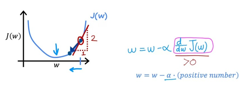 이러한 과정을 통해 우리는 아래의 사진처럼 초기값을 잡았을 때, 도함수의 결과값이 언제나 양수가 된다는 것을 알게 되었다. 따라서 이때 w의 값은 항상 줄어든다는 것을 알 수 있다.