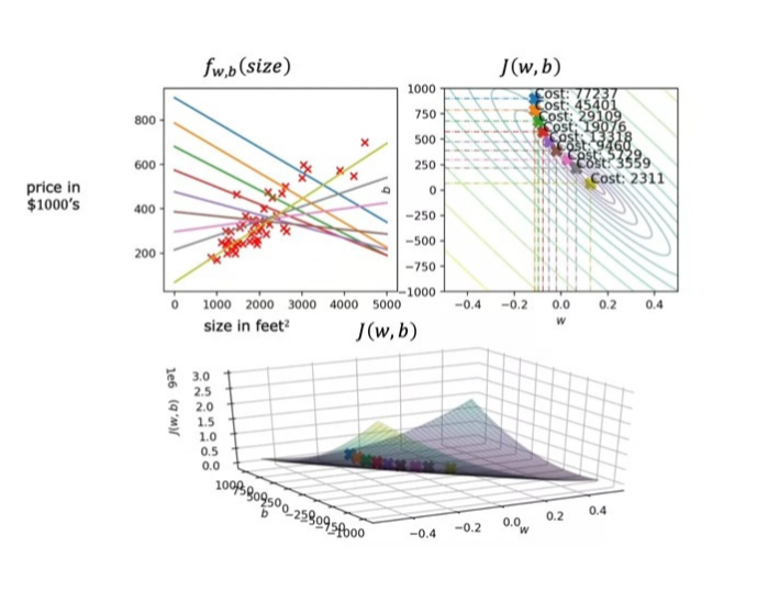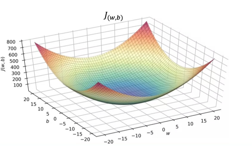 아래의 사진은 최적의 값을 찾기 위해 w, b를 조정해 가면서 가장 작은 의 값을 구하는 것을 나타낸다.