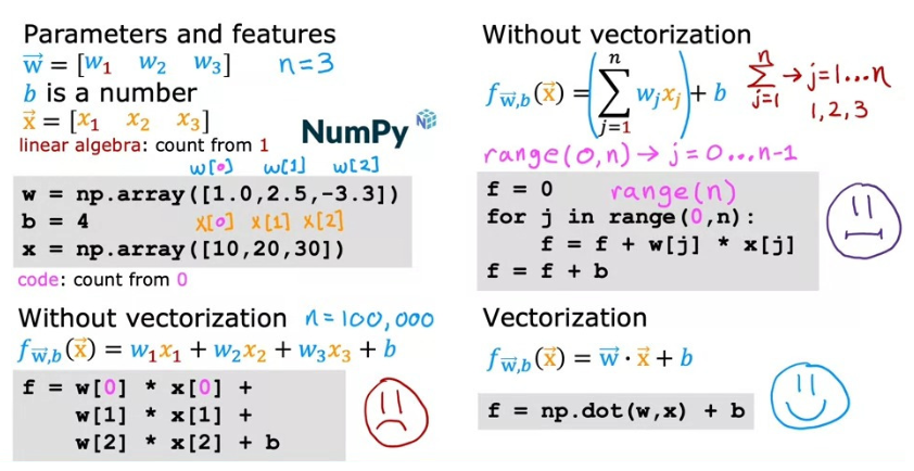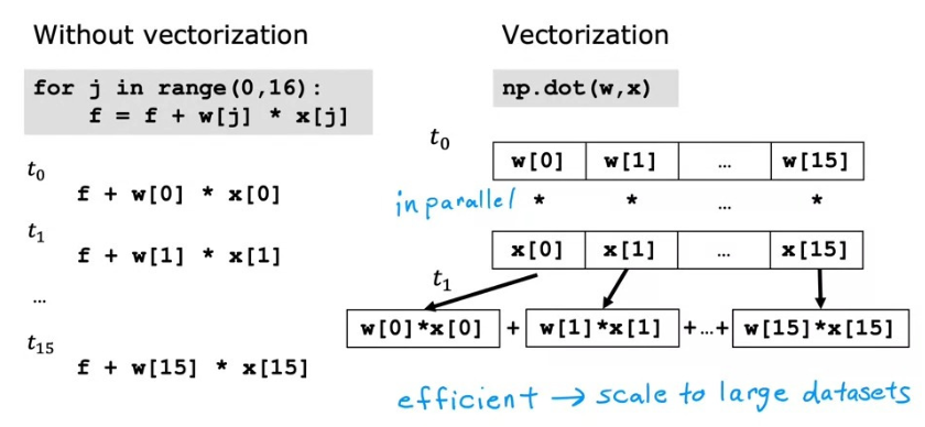 Vectorization은 파라미터 w와 input x를 벡터 형식으로 구성한 뒤, 이 둘을 dot product하는 방식으로, NumPy dot 함수를 통해 구현이 가능합니다.