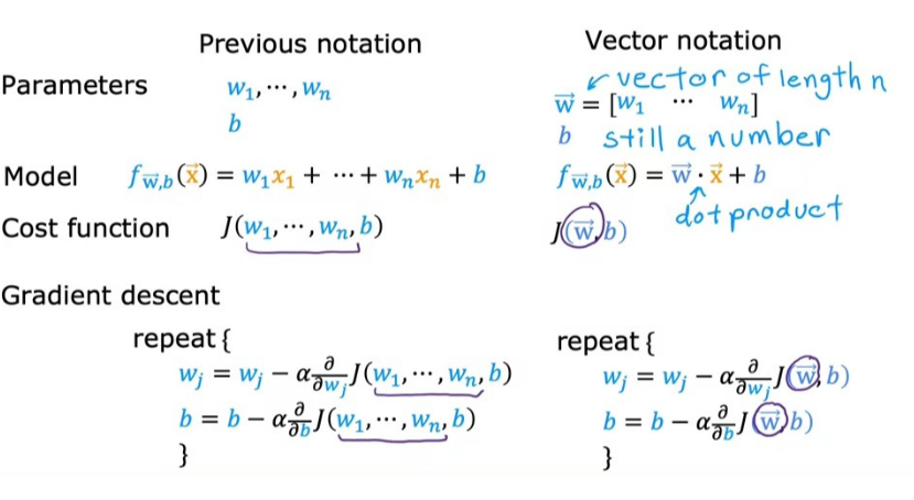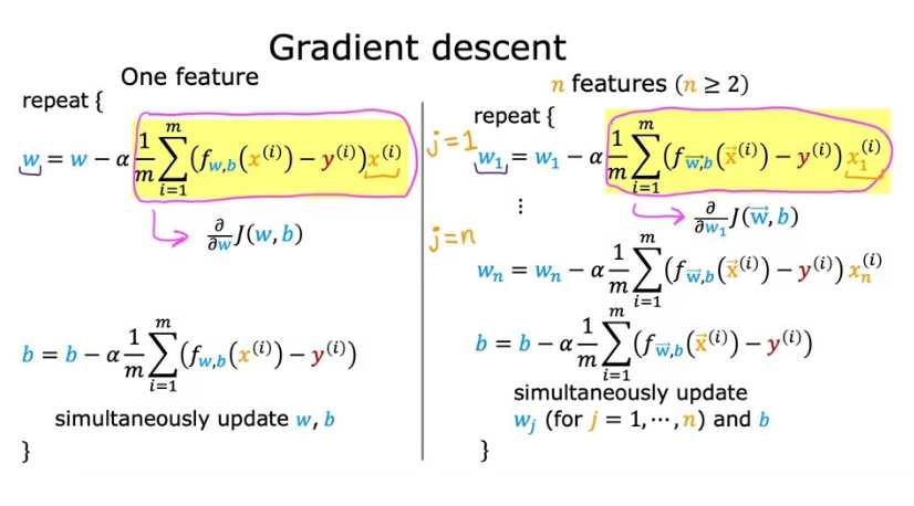 또, 도함수의 항에 대해서도 살펴보면, 하나의 feature 값이 존재할 때와는 다르게, n개의 모든 w 값에 대해 편미분을 하고, learning rate와 곱한 뒤에 모든 w 값, 그리고 하나의 b 값을 동시에 업데이트한다는 점에서 차이가 존재하는 걸 확인할 수 있습니다. (이전에는 하나의 w, 하나의 b 값만 존재했기에 여러 개 w 값을 고려할 필요가 없었습니다)